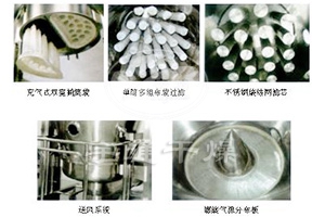將制粒用的粉末物料放入流化床內(nèi),物料粉末粒子在原料容器中呈環(huán)形流化狀態(tài),受到經(jīng)過凈化后的加熱空氣預(yù)熱和混合,將粘合劑溶液霧化噴入,使若干粒子聚集成含有粘合劑的團粒,由于熱空氣對物料的不斷干燥,使團粒中水分蒸發(fā),粘合劑凝固,此過程不斷重復進行,形成理想的、均勻的多微孔球狀顆粒。