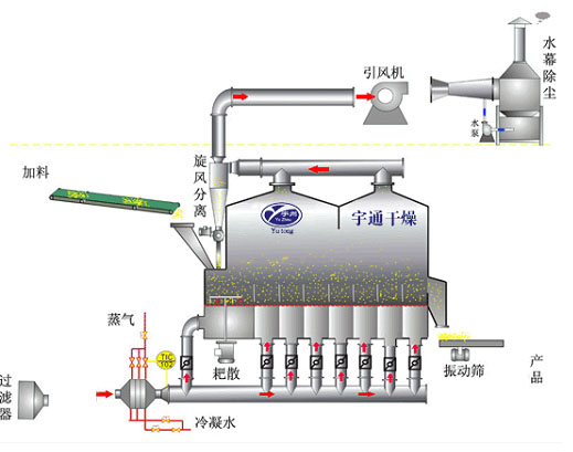 散粒狀固體物料由加料器加入流化床干燥機中, 潔凈的熱風(fēng)經(jīng)閥板分配進入床體內(nèi),從加料器進入的濕物料被熱風(fēng)形成沸騰狀態(tài)。由于熱風(fēng)與物料廣泛接觸,增強了傳熱傳質(zhì)的過程,因此在較短時間內(nèi)就可干燥。物料從床體的一頭進入,經(jīng)過幾十秒至幾分鐘沸騰干燥后由排料口排出, 廢氣由沸騰床頂部排出經(jīng)旋風(fēng)除塵器組和布袋除塵器回收固體粉料后排空。