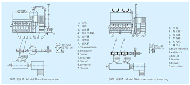 XF系列臥式沸騰干燥機又稱流化床或者沸騰床,它是由空氣過濾器、沸騰床主機、旋風(fēng)分離器、布袋除塵器、高壓離心通風(fēng)機、操作臺組成。由于干燥物料的性質(zhì)不同,配套除塵設(shè)備時,可按需要考慮,可同時選擇旋風(fēng)分離器、布袋除塵器,也可選擇其中一種。一般來說,比重較大的沖劑及顆粒物料干燥只需選擇旋風(fēng)分離器。比重較輕的小顆粒狀和粉狀物料需配套布袋除塵器,并備有氣力送料裝置及皮帶輸機供選擇。蒸氣、電、熱風(fēng)爐均可配用(按用戶要求配套)。
