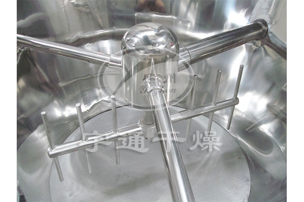 空氣經(jīng)加熱凈化后,由引風機從下部導入,穿過料斗的孔網(wǎng)板。在工作室內(nèi),經(jīng)攪拌和負壓作用形成流態(tài)化,水份快速蒸發(fā)后隨著排氣帶走,物料快速干燥。